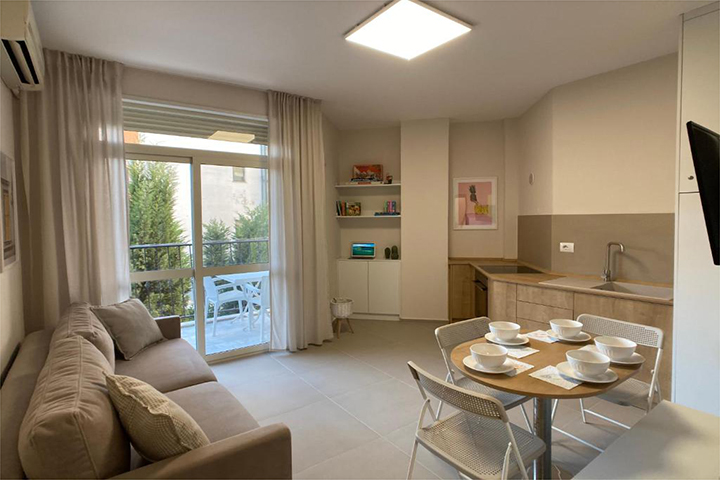 Situated on the ground floor, this studio is very bright and a perfect home away from home. It can accommodate up to 4 people. The kitchen is fully equipped and the living space has a sofa bed. There is AC in the apartment and of course the beach to cool off. You can enjoy your meals “al fresco” on the terrace.