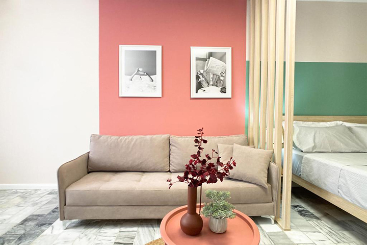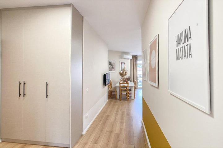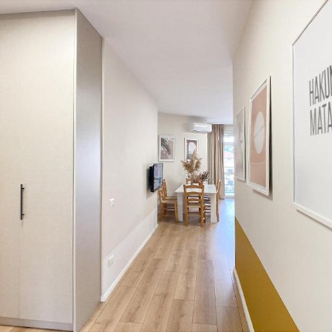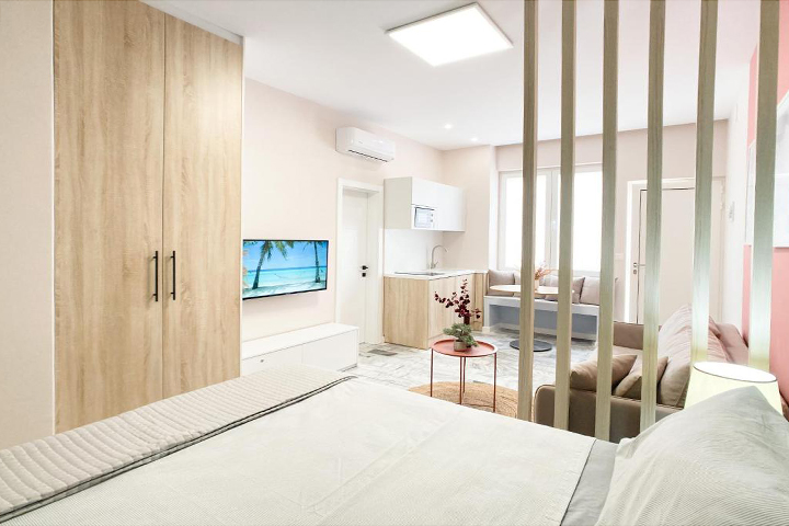 A two-bedroom apartment with a unique style is a perfect home away from home. It can accommodate up to 7 people. The kitchen is fully equipped and the living room has a sofa bed. There is AC in the apartment and of course the beach to cool off. Parking space guarantee.