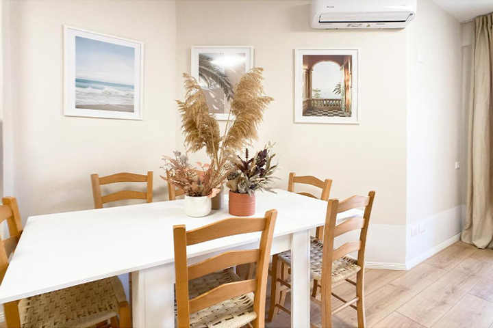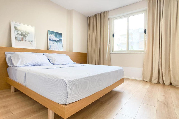 This two-bedroom apartment is very bright and a perfect home away from home. It can accommodate up to 6 people. The kitchen is fully equipped and the living room has a sofa bed. There is AC in the apartment and of course the beach to cool off.